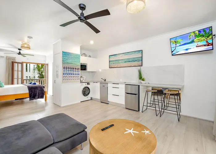 El apartamento de 46 m² se sitúa a unos 5 minutos a pie del centro de Palm Cove. Los huéspedes pueden explorar cómodamente Palm Cove y llegar a la Playa de Palm Cove, situada a 750 metros. No tardarás mucho en llegar al Zoológico Nocturno de Cairns, situado a 1 km.